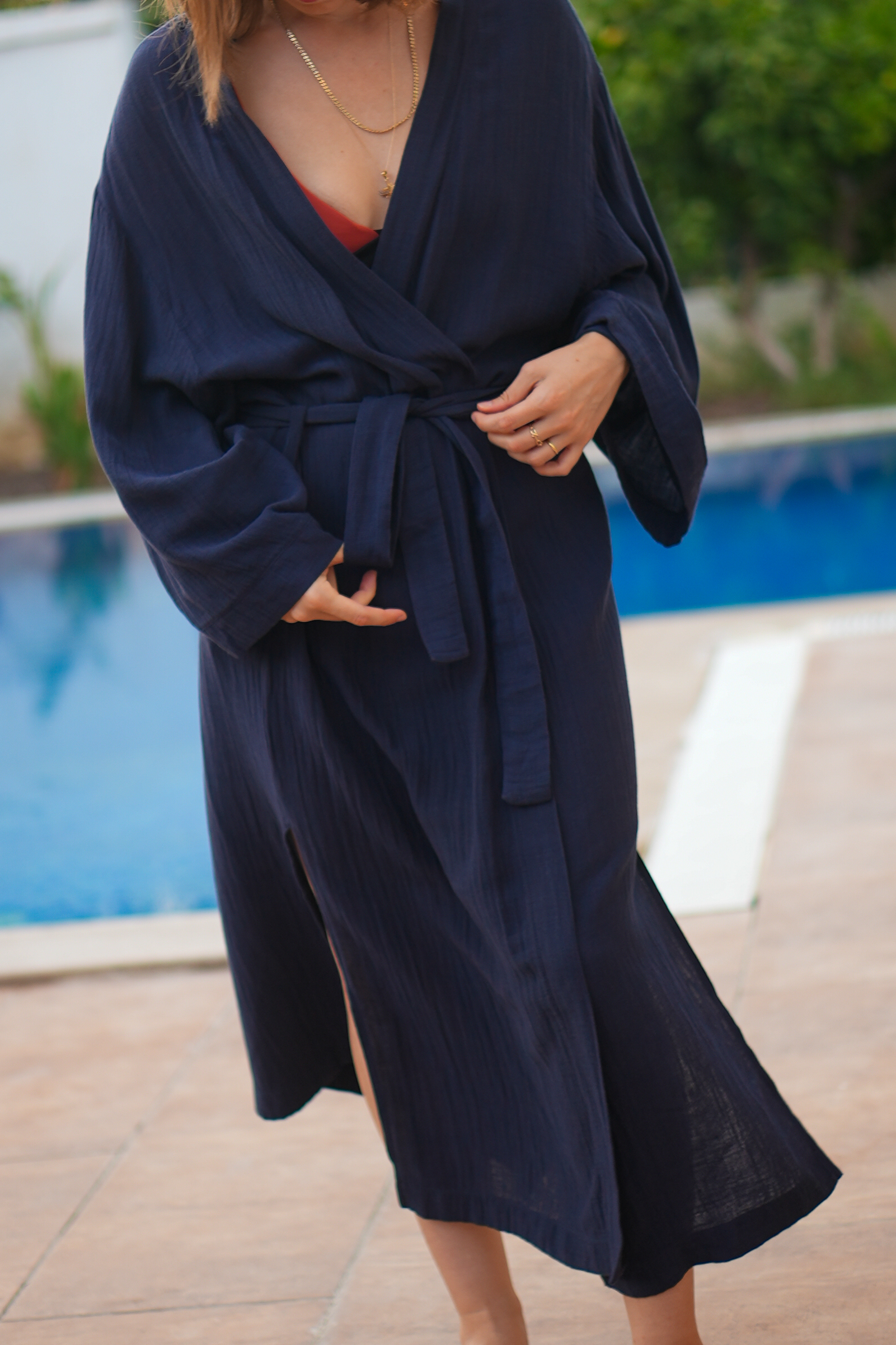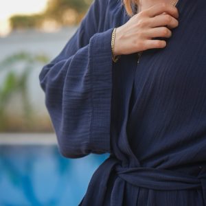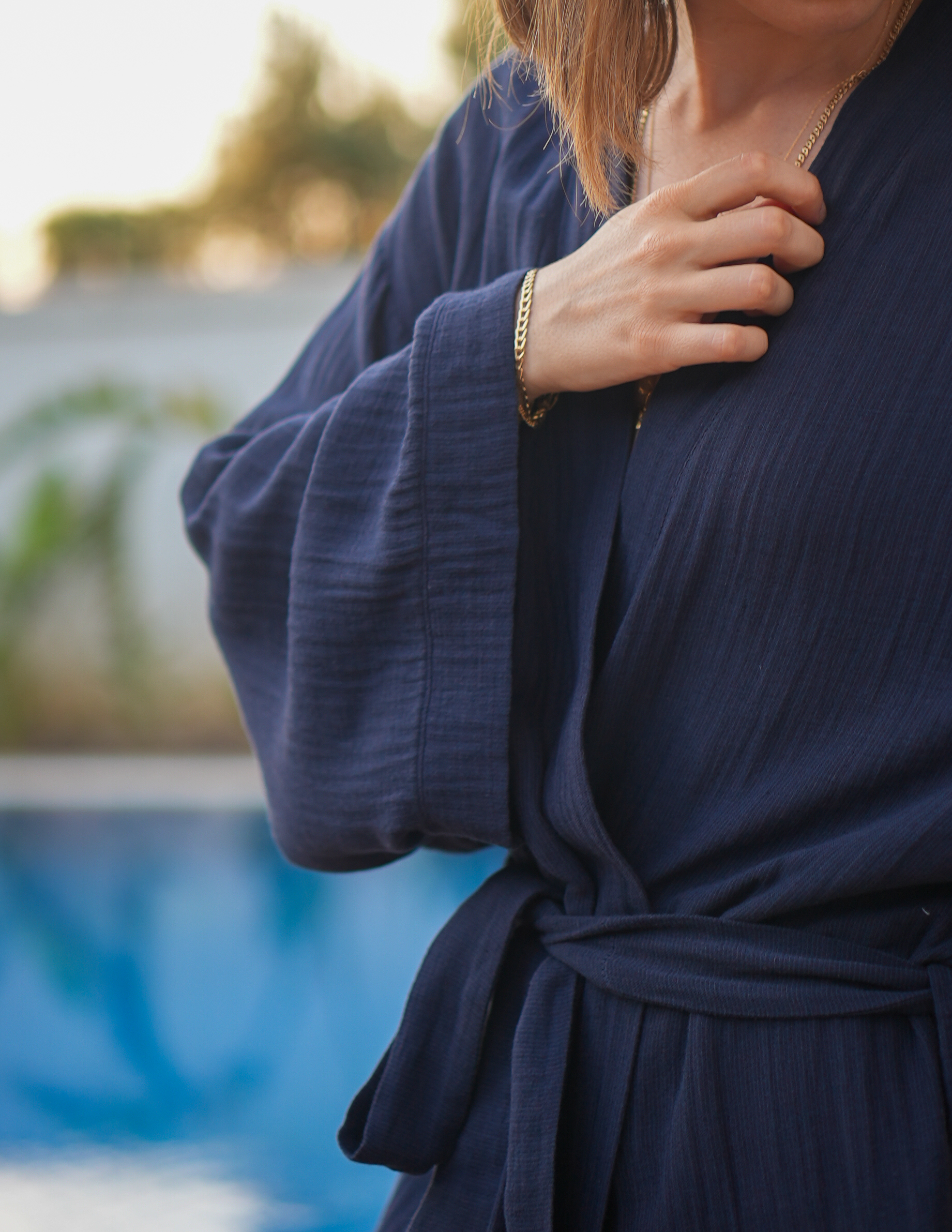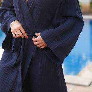 The perfect blend of modern elegance and comfort, the long muslin kimono adds a touch of sophistication to your wardrobe. Made from bamboo-cotton two layers natural muslin fabric, it offers breathable and lightweight wear, ideal for all seasons. Its soft texture and skin-friendly properties make it both stylish and comfortable. Additionally, the sustainable and eco-friendly nature of muslin fabric shows your respect for the environment.